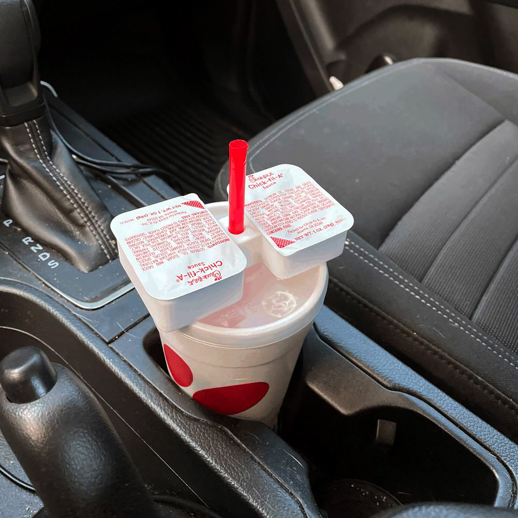 - Держатель соусов — маленькая, но незаменимая вещь в машине. Не занимает много места, спокойно дожидается своего часа в бардачке.