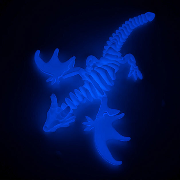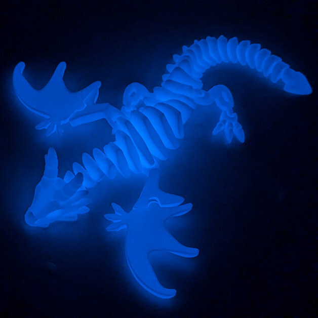 Подвижная, гибкая игрушка-антистресс из экологичного пластика Glow Pla. Напечатана на 3D принтере с люминесцентным эффектом. Пластик не имеет посторонних запахов. Светится в темноте около 10 минут, если предварительно поднести фигурку к лампе люстры. Зарядившись от света, одарит вас удивительным голубым свечением.