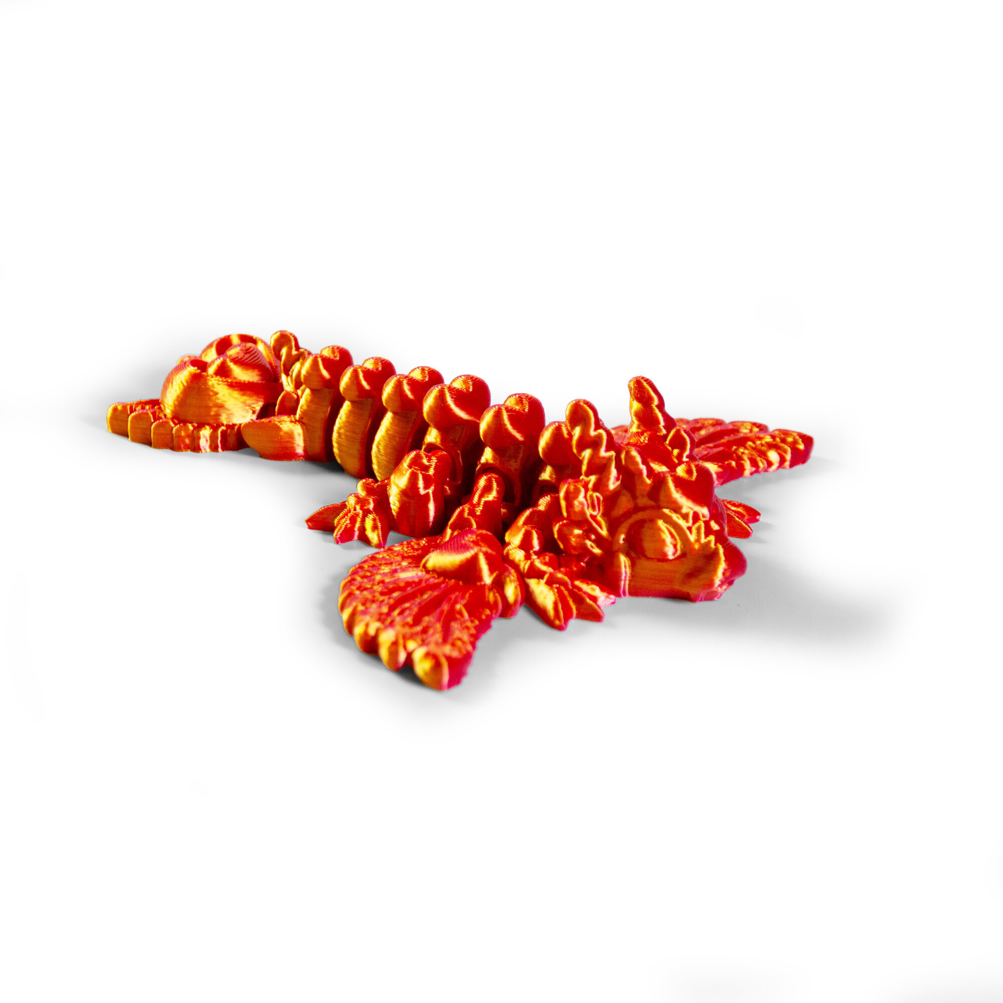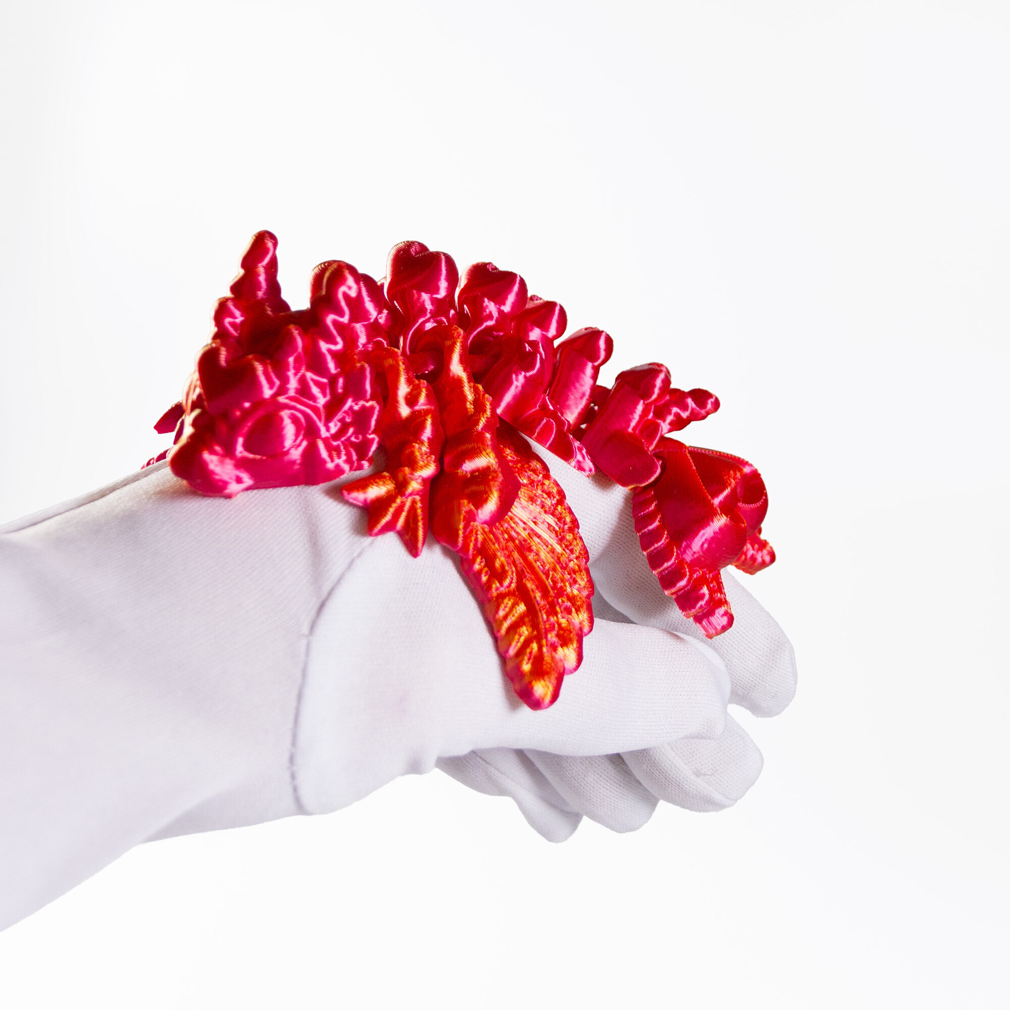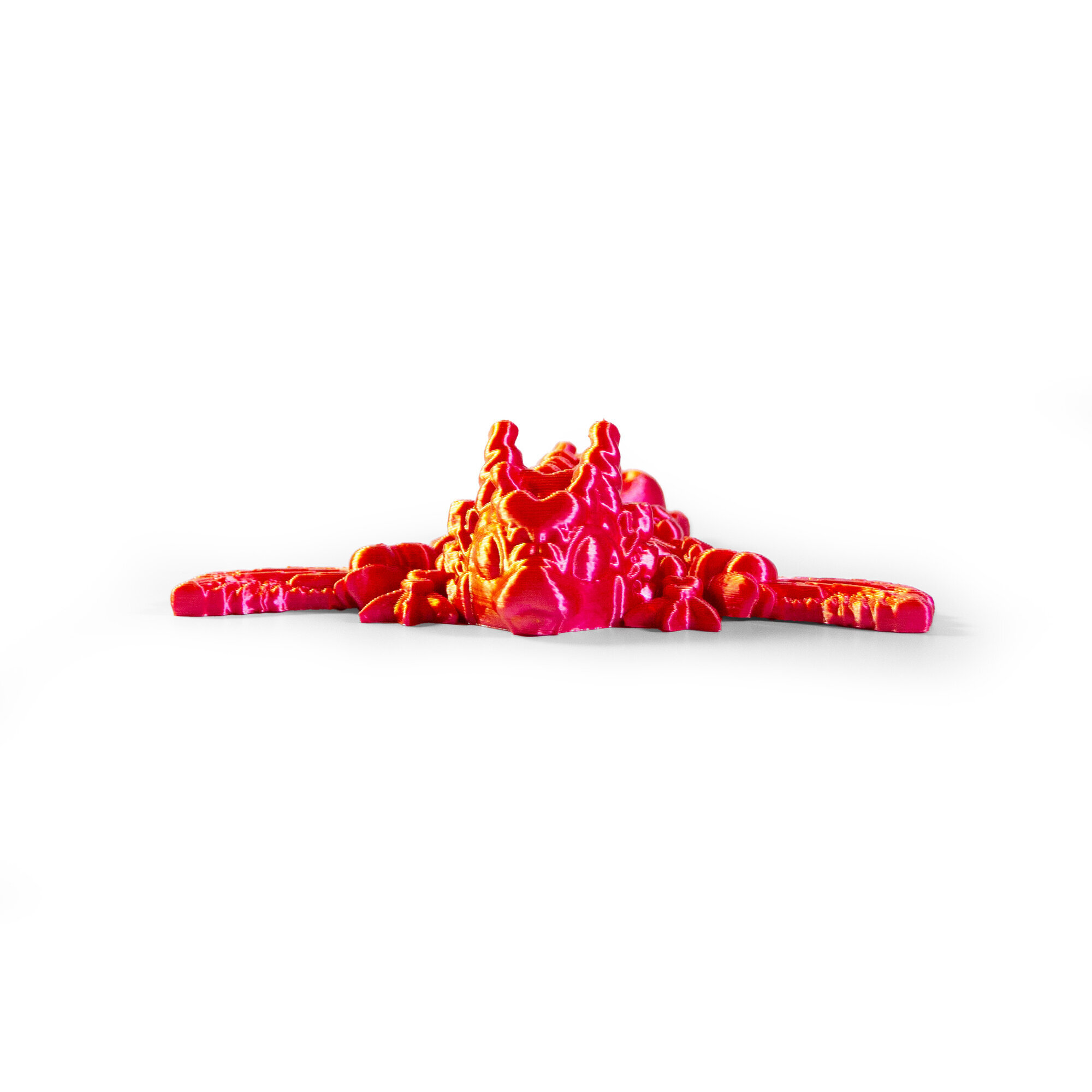 - Фигурка дракона напечатана на 3D принтере из экологичного пластика PLA silk ярко-красного цвета с золотым переливом. Шарнирная конструкция с подвижными позвонками позволяет создавать различные позы и направления, не боится воды, без посторонних запахов.