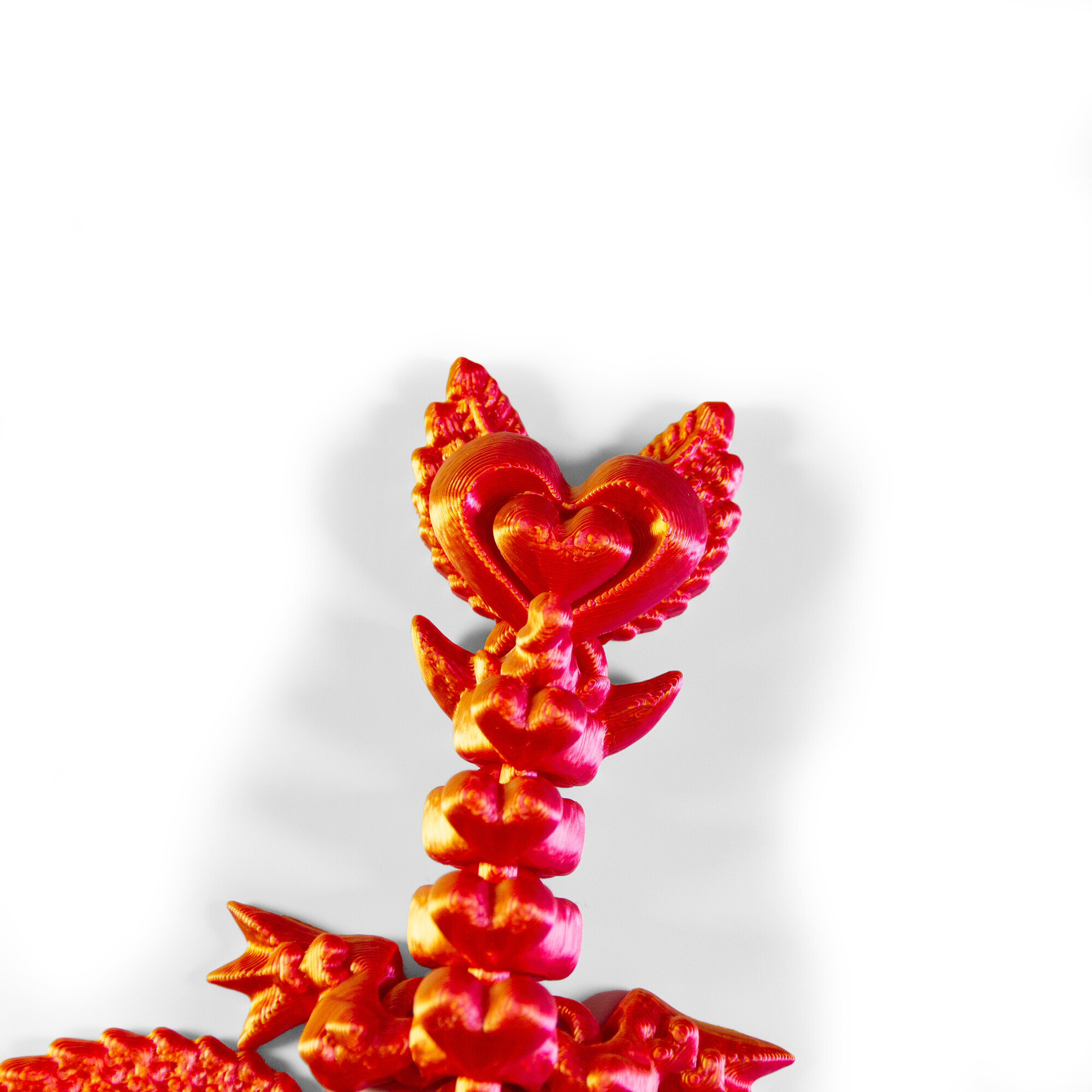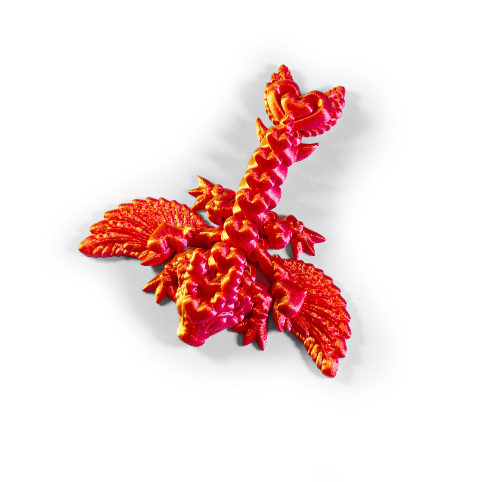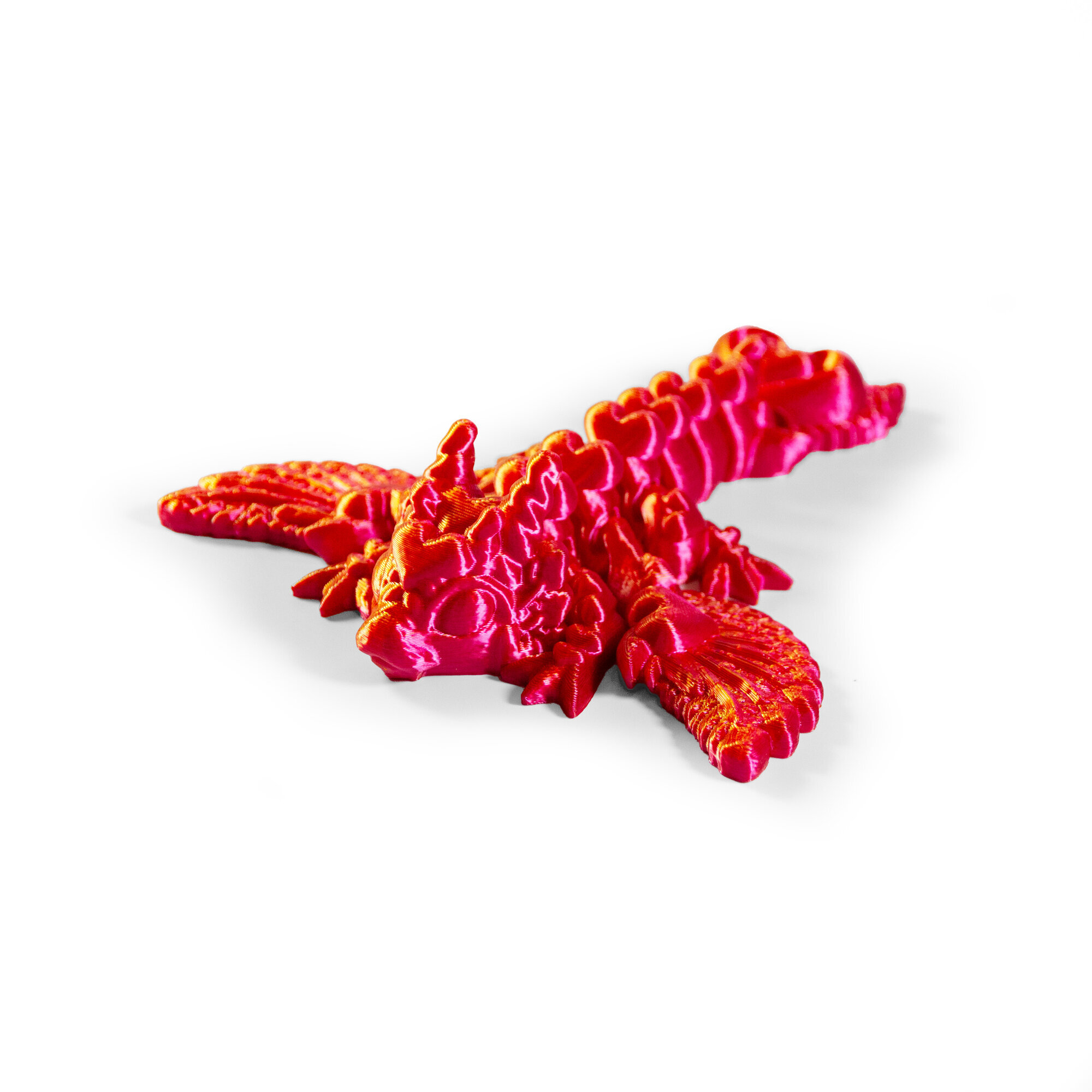 - Фигурка дракона напечатана на 3D принтере из экологичного пластика PLA silk ярко-красного цвета с золотым переливом. Шарнирная конструкция с подвижными позвонками позволяет создавать различные позы и направления, не боится воды, без посторонних запахов.
