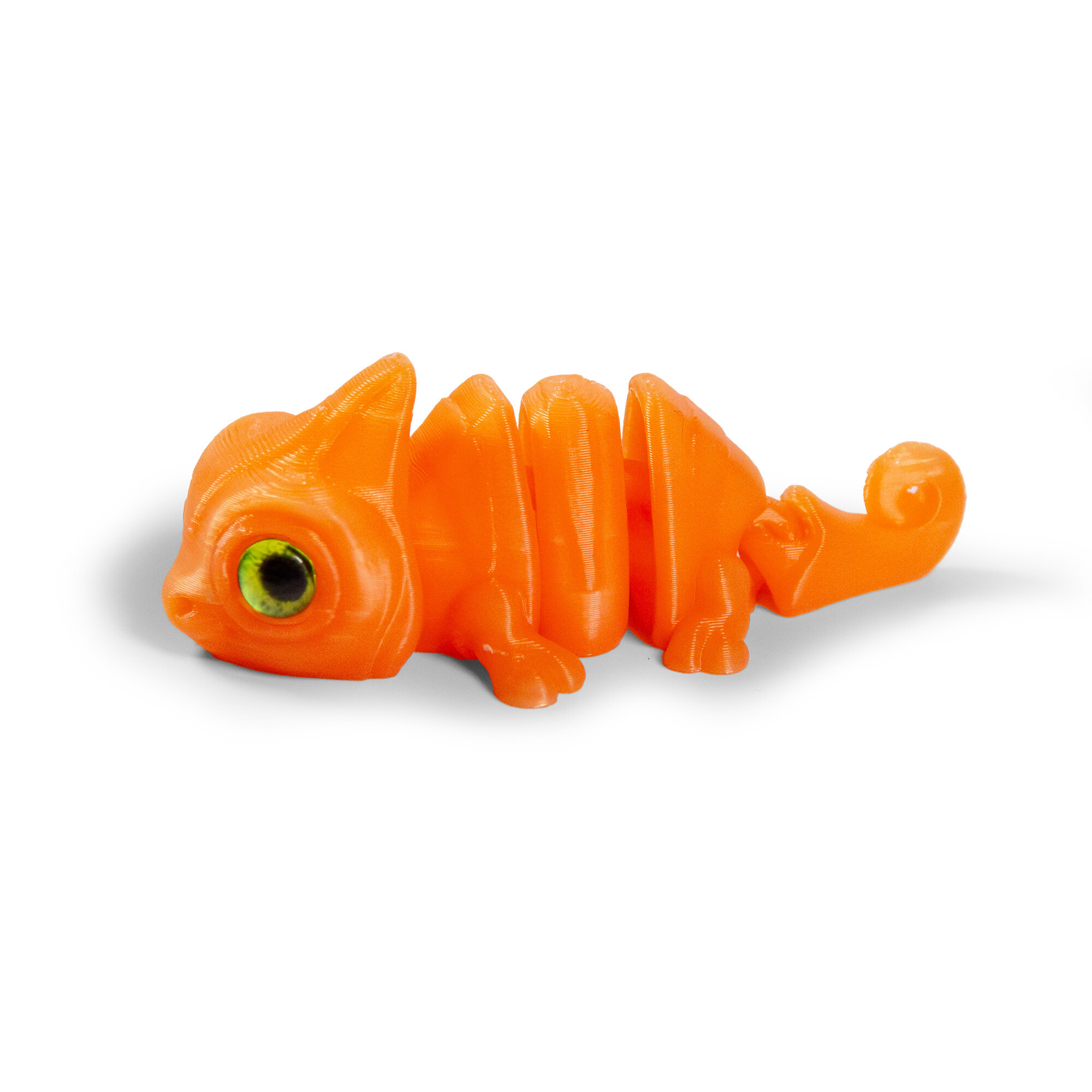 Фигурка хамелеона не требует сборки, она готова к использованию. Напечатана на 3D принтере из термохромного пластика оранжевого цвета, который при нагревании меняет цвет на желтый.