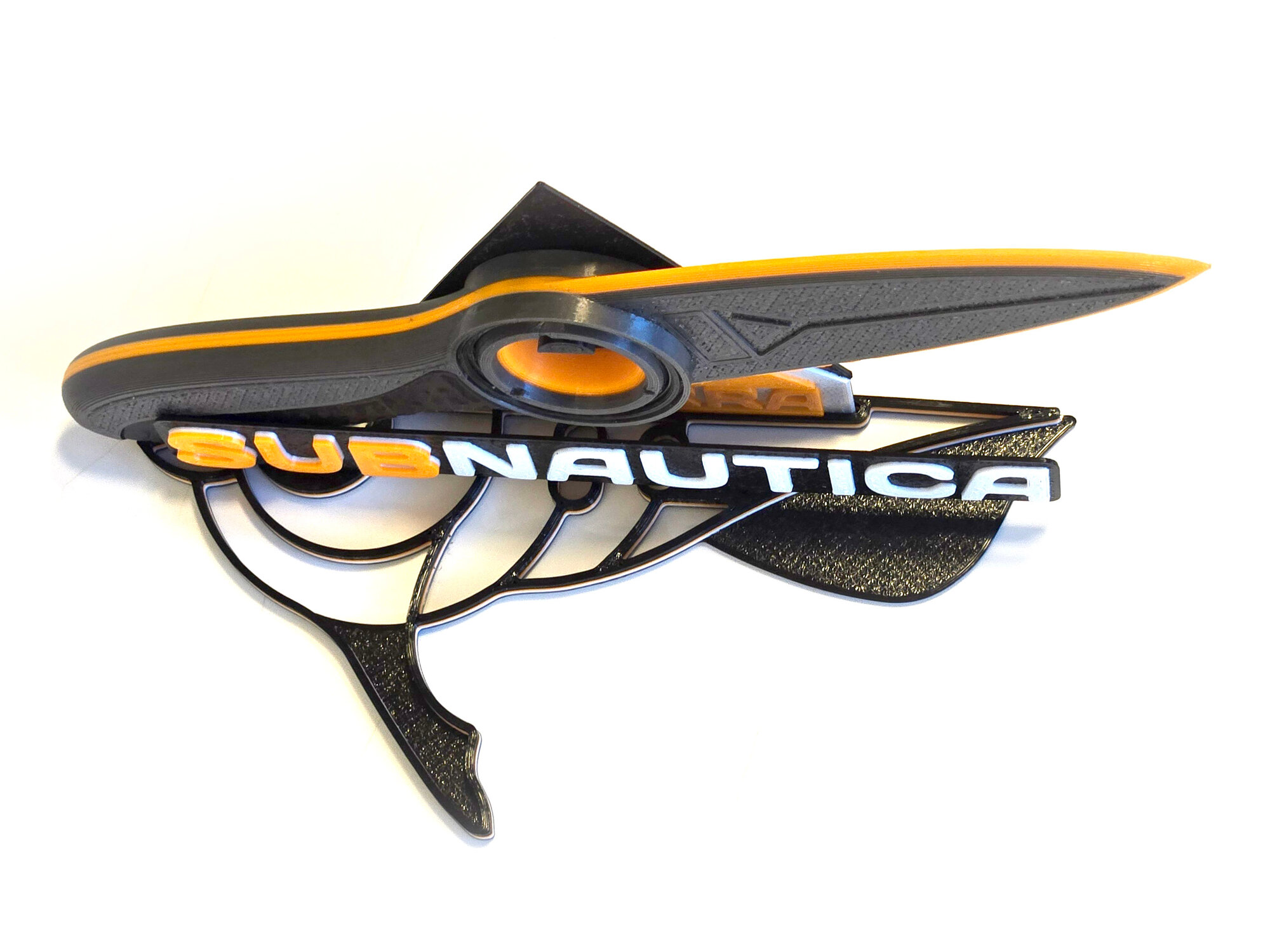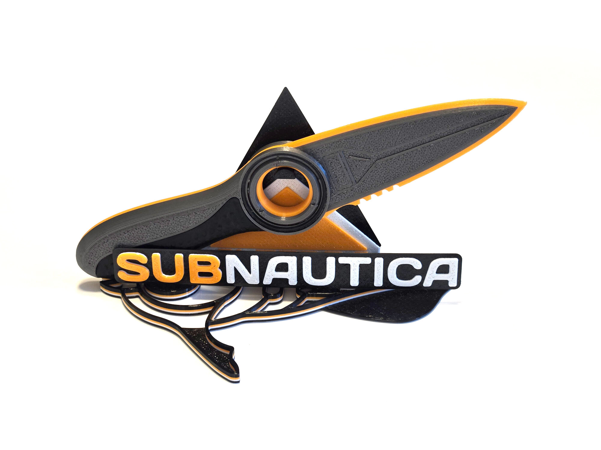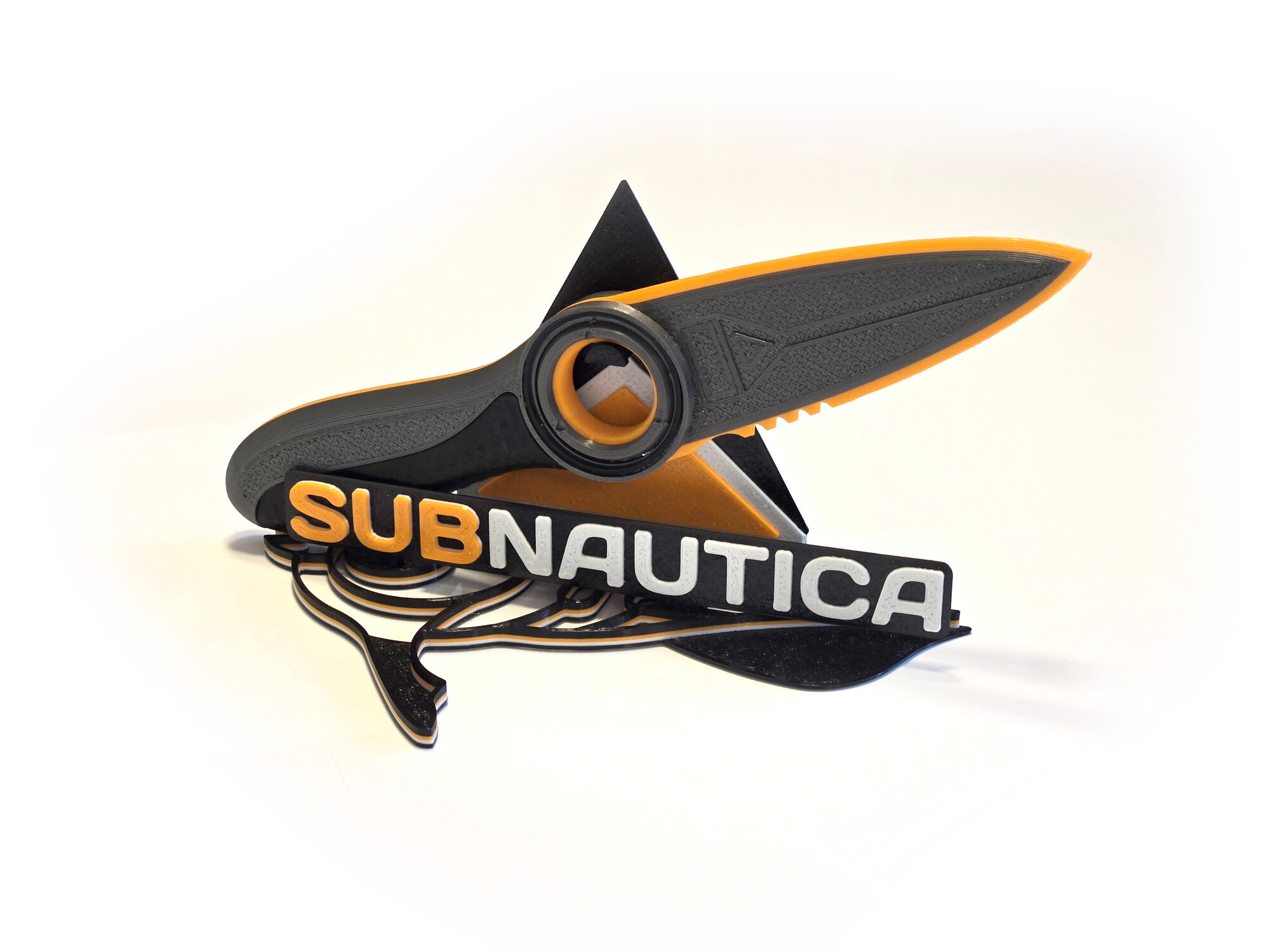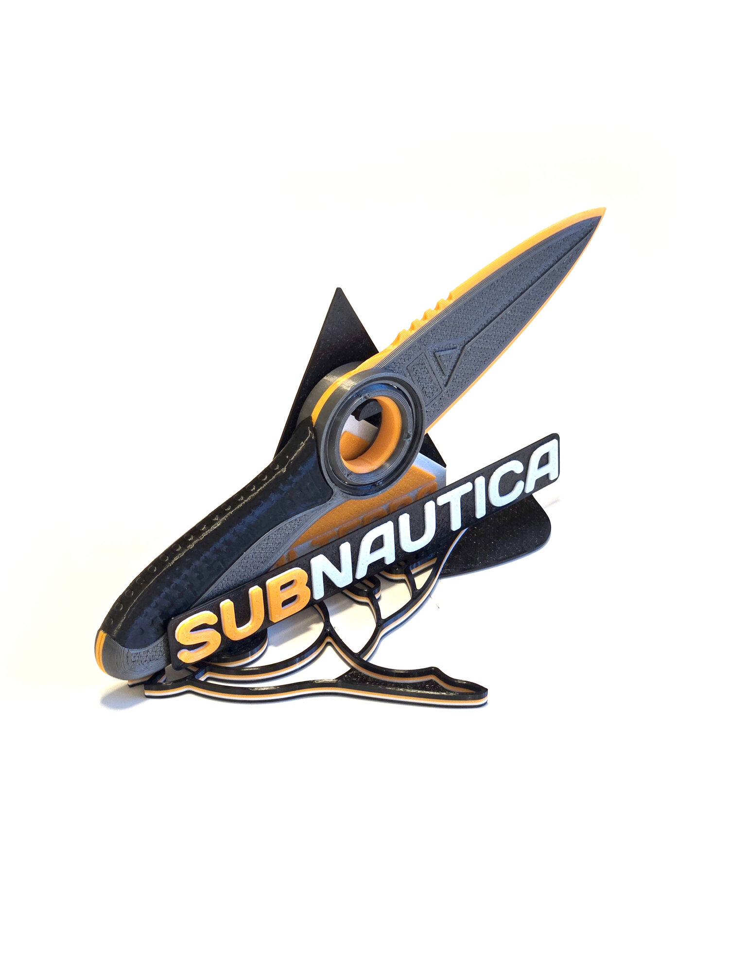 Сувенир в виде ножа из игры Subnautica Сабнатика с брендированной подставкой. Напечатан на 3D принтере из пластика PETG. Конструктив включает в себя вращающееся центральное кольцо, оранжевую кромку лезвия и черную рукоять. Подставка имеет разборную конструкцию и поставляется в комплекте с ножом. Не имеет посторонних запахов, не портится от воды. Изделие абсолютно безопасно. Удобно лежит в руке, максимально приближено к оригинальному игровому оружию, позволяет реально окунуться в атмосферу подводного симулятора выживания.