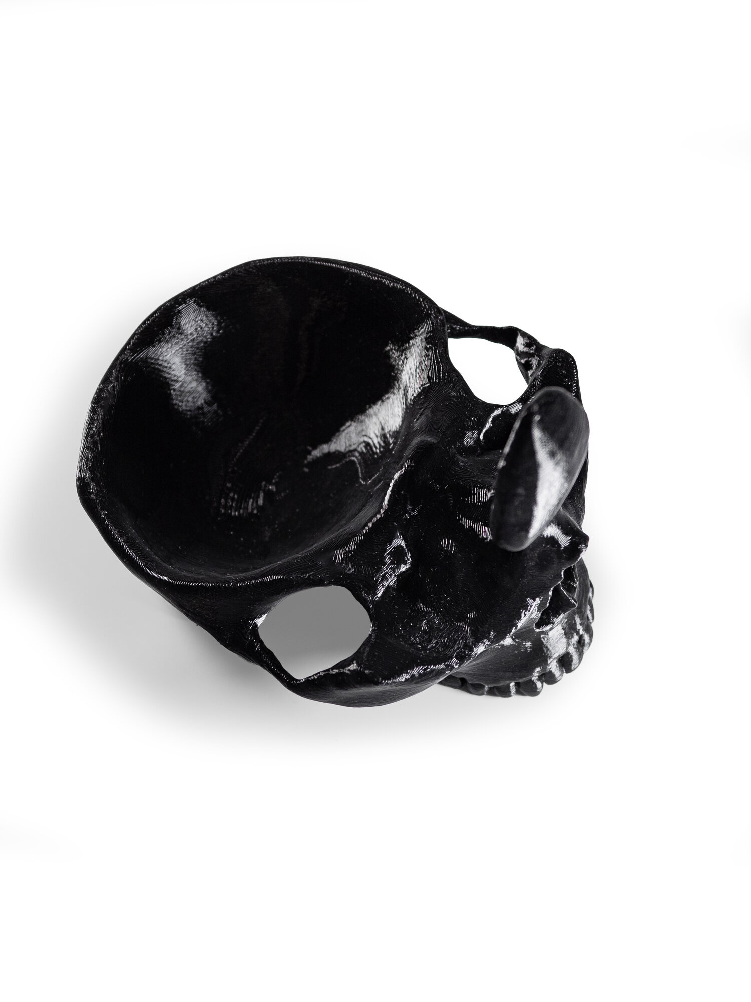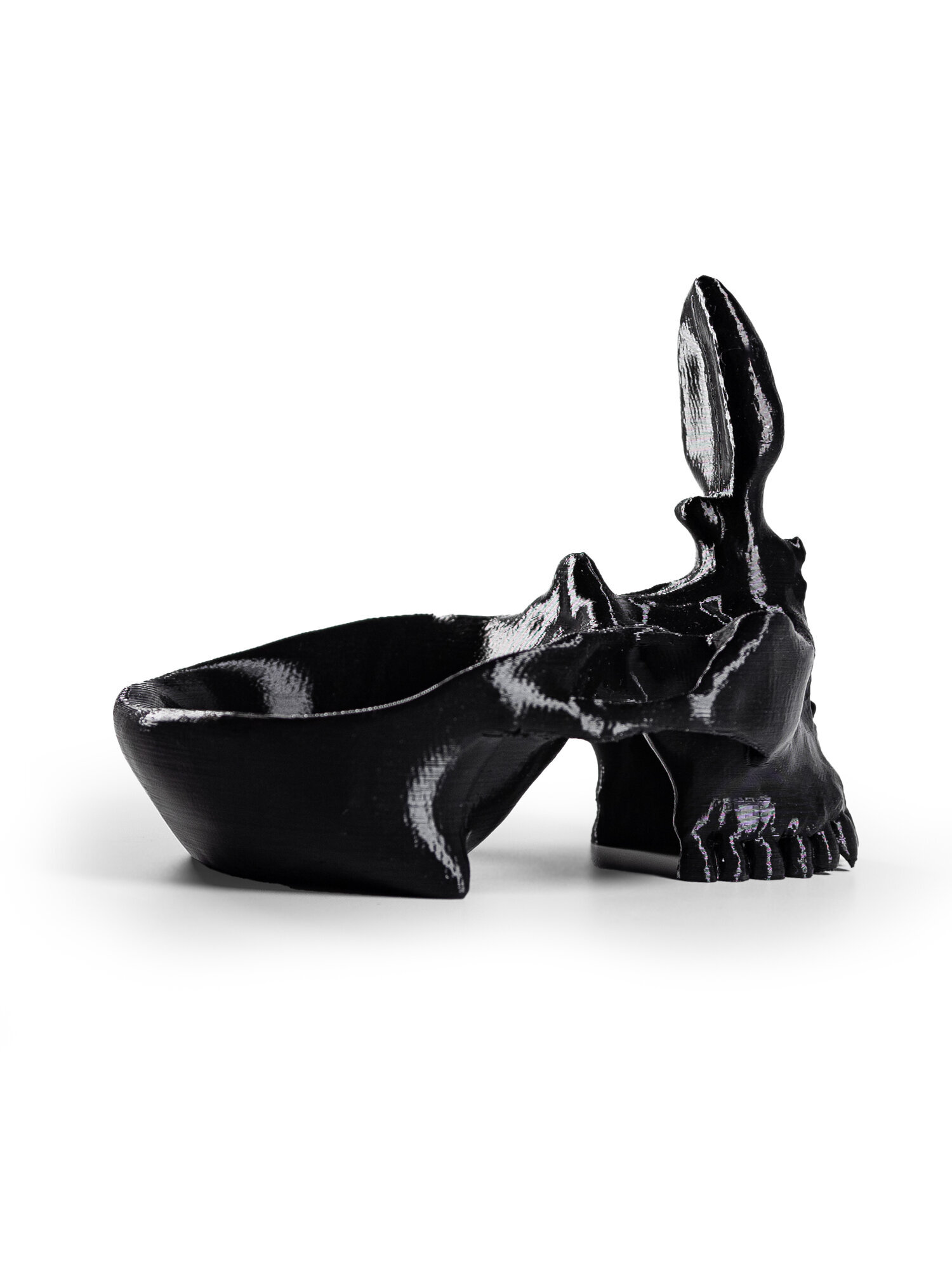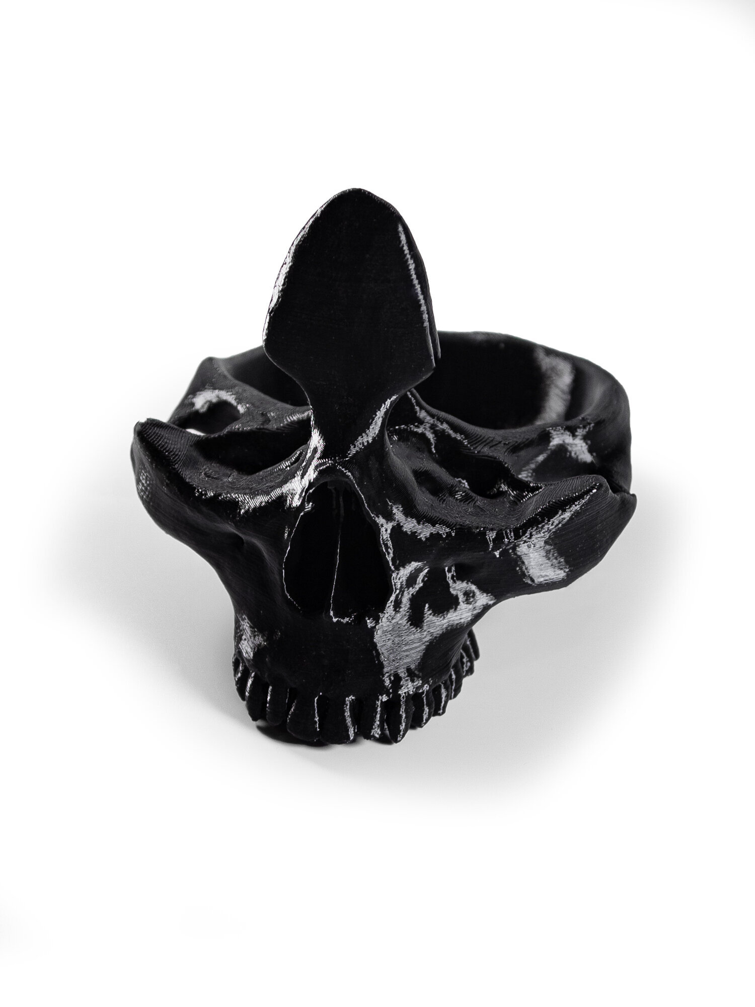 PetG пластик, из которого напечатан череп, изготавливают пищевые бутылки. В земле данный пластик разлагается примерно за 115-150 лет, он достаточно устойчив к УФ излучению (в отличие от PLA или ABS), выдерживает упругие (ветровые) нагрузки и боится только нагрева более 70градусов.
