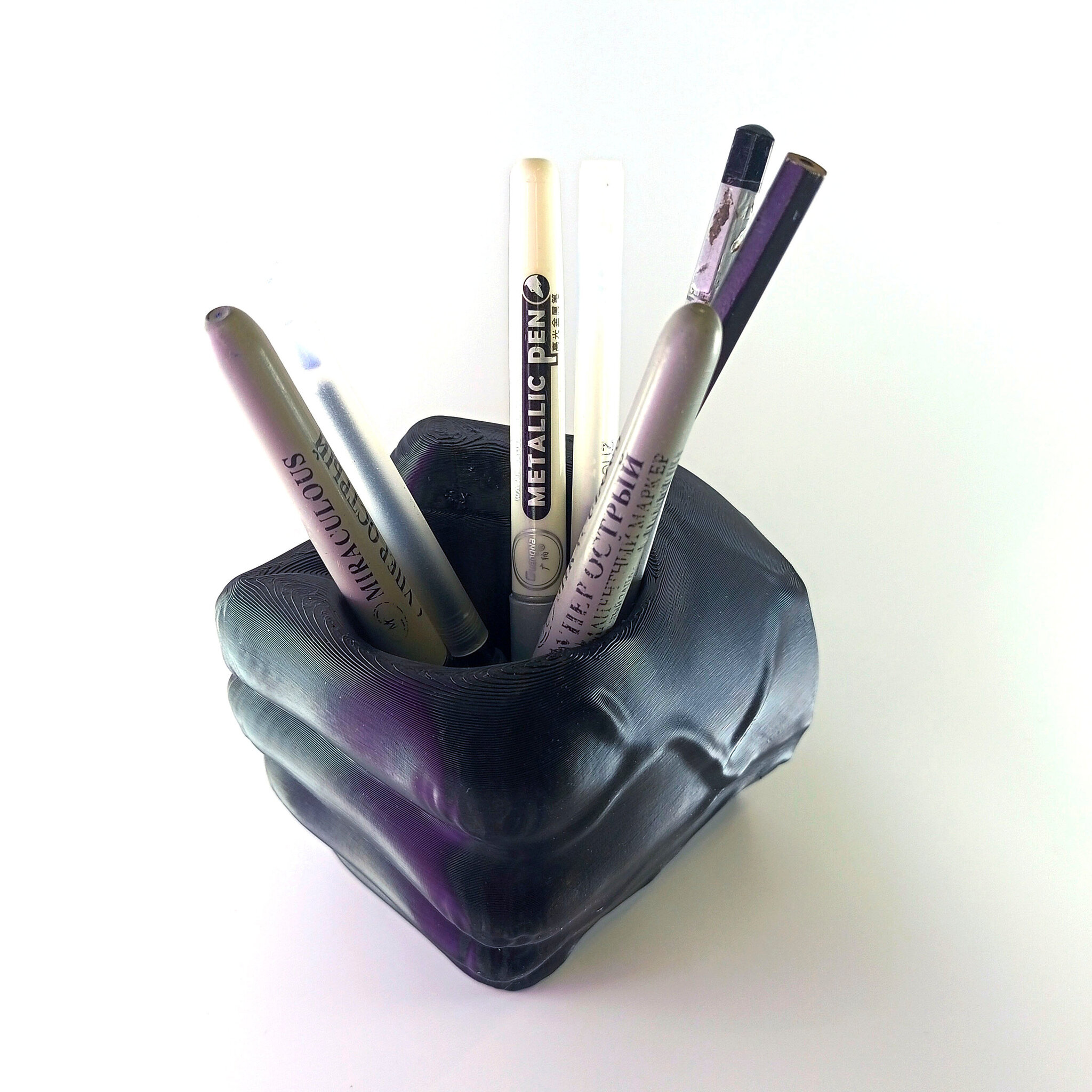 Канцелярская подставка распечатана на 3D-принтере из экологичного пластика, который не имеет посторонних запахов и не портится при попадании на него воды.