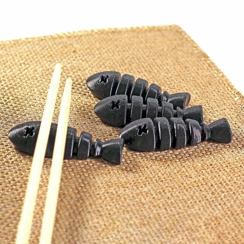В наборе 4 рыбки (60Х20 мм.). Напечатаны на 3D принтере из экологичного пластика, который не имеет посторонних запахов, не теряет яркость и не портится от воды. Палочки для еды в комплект не входят.