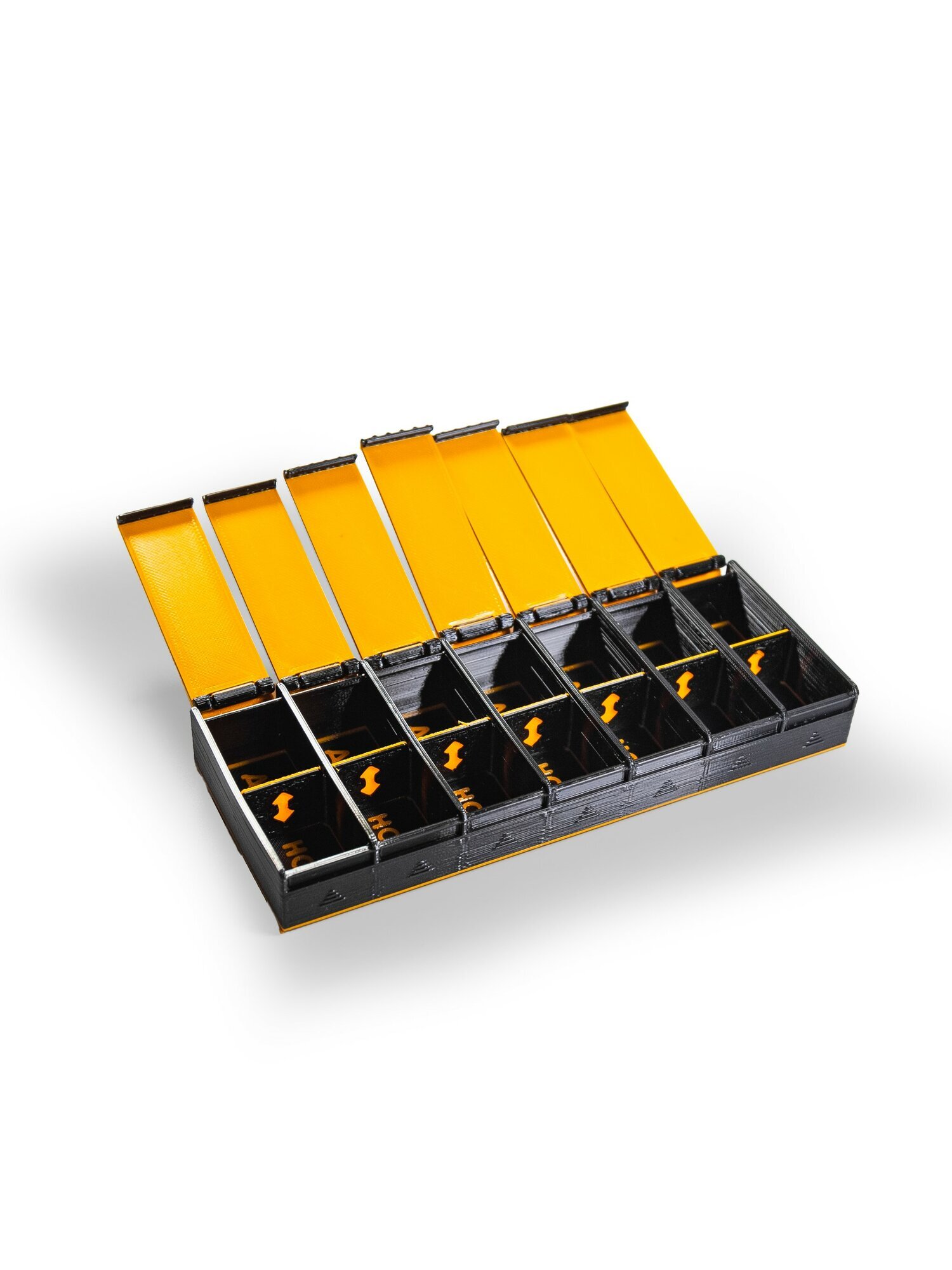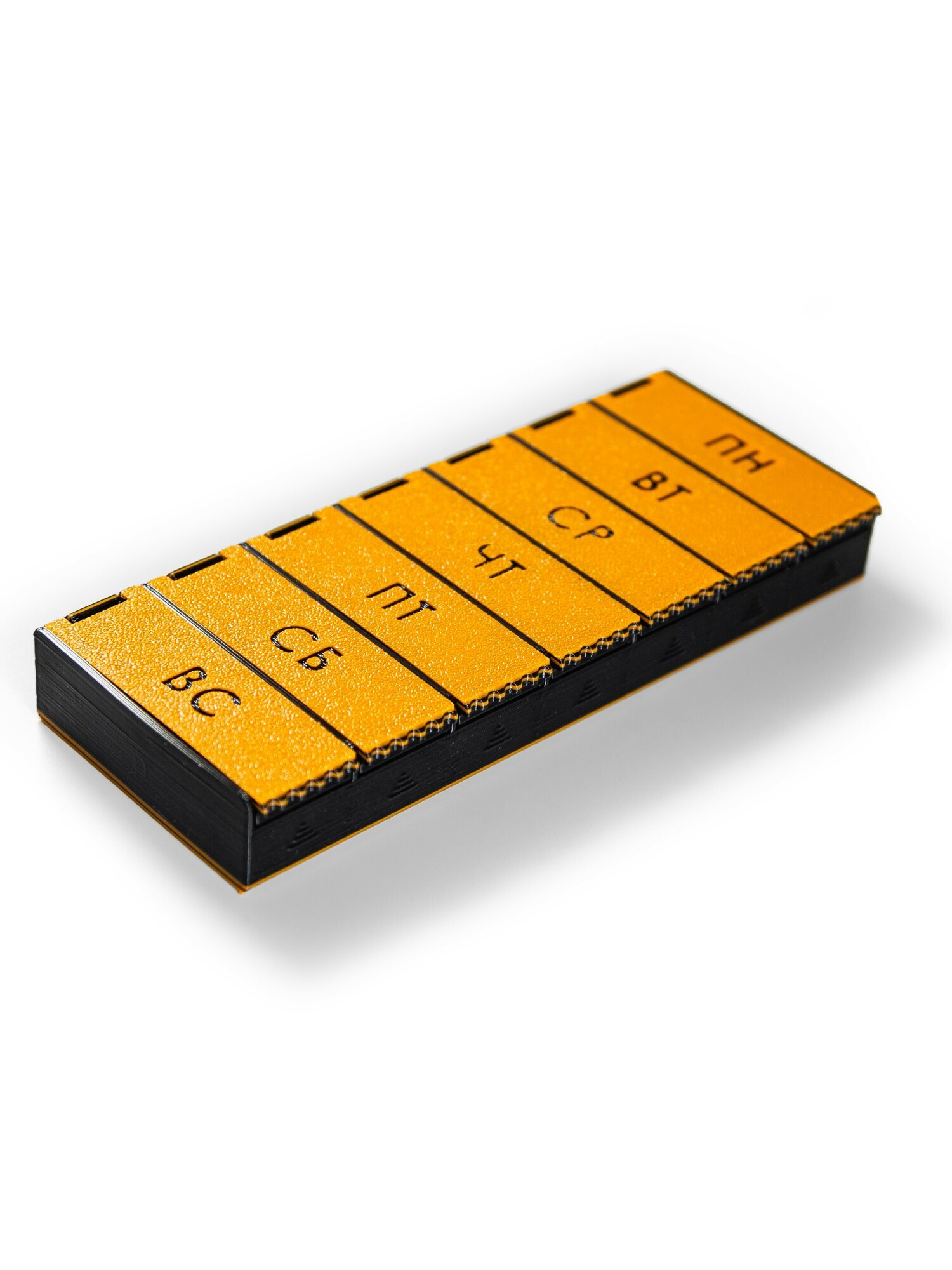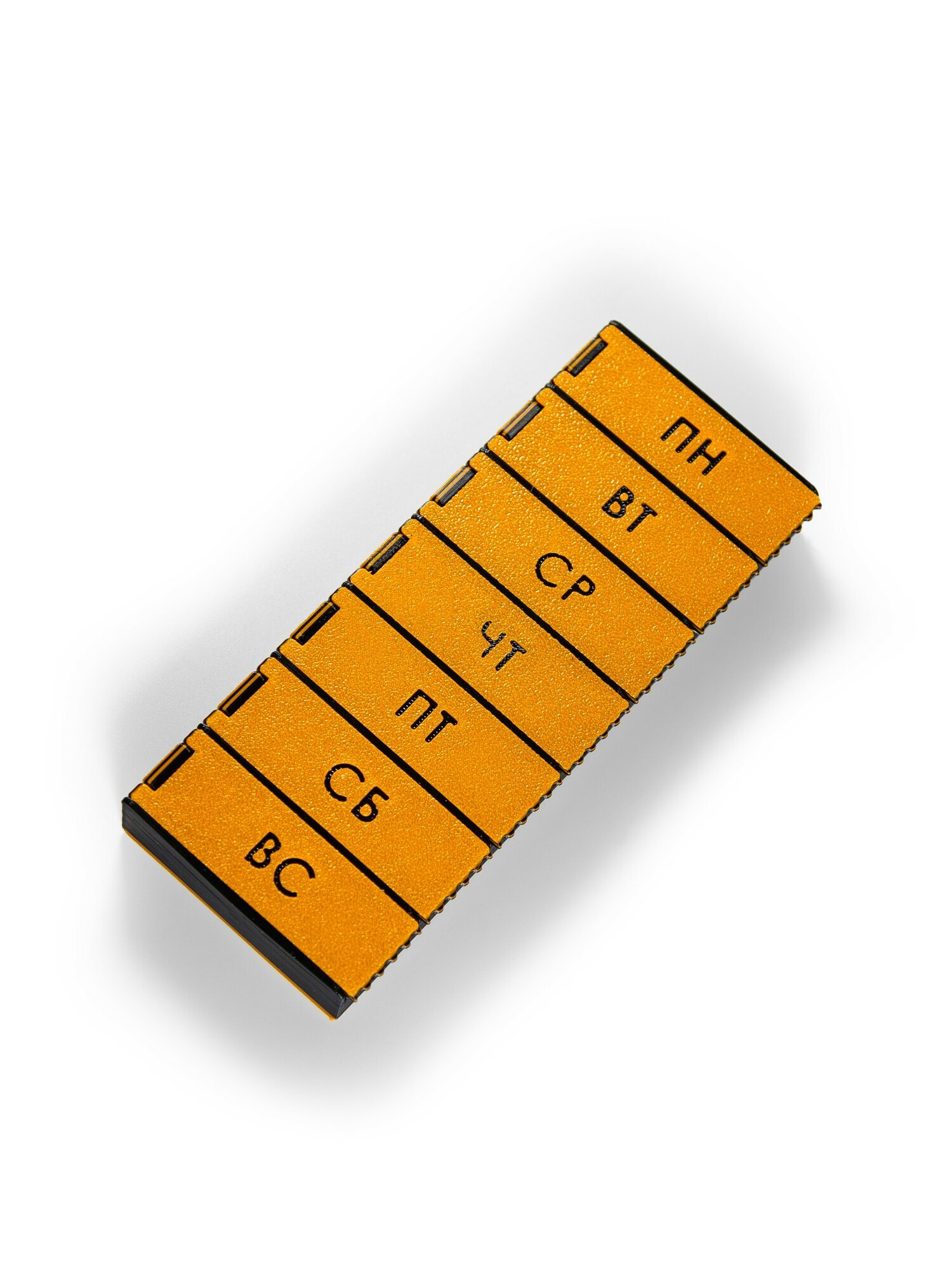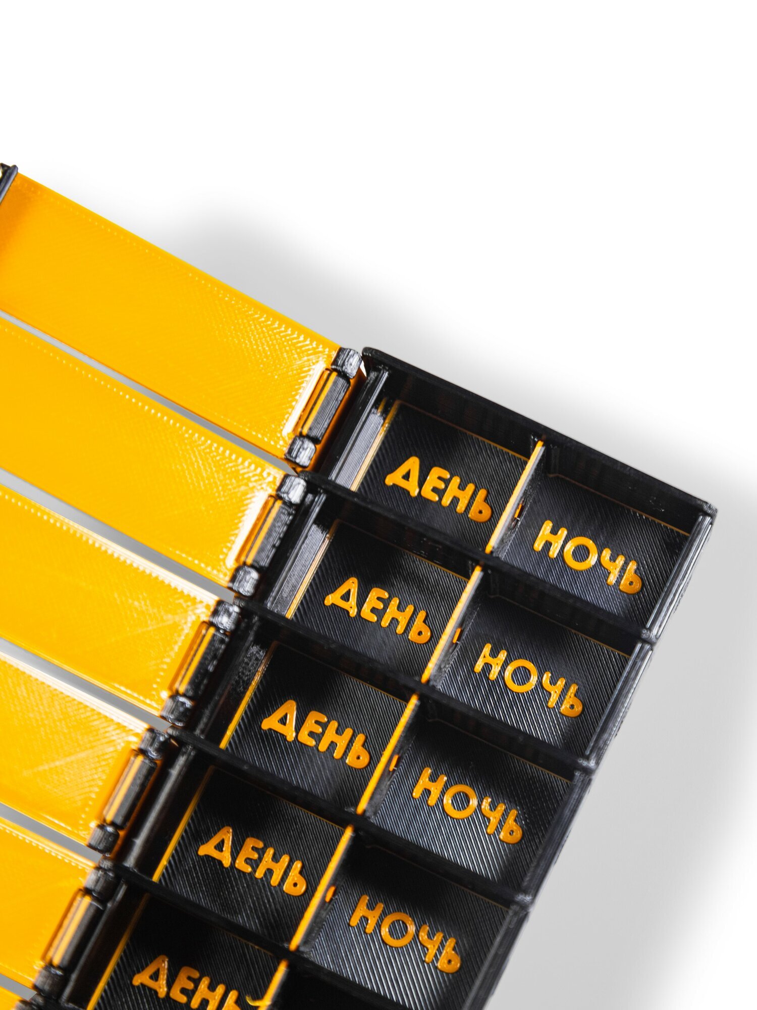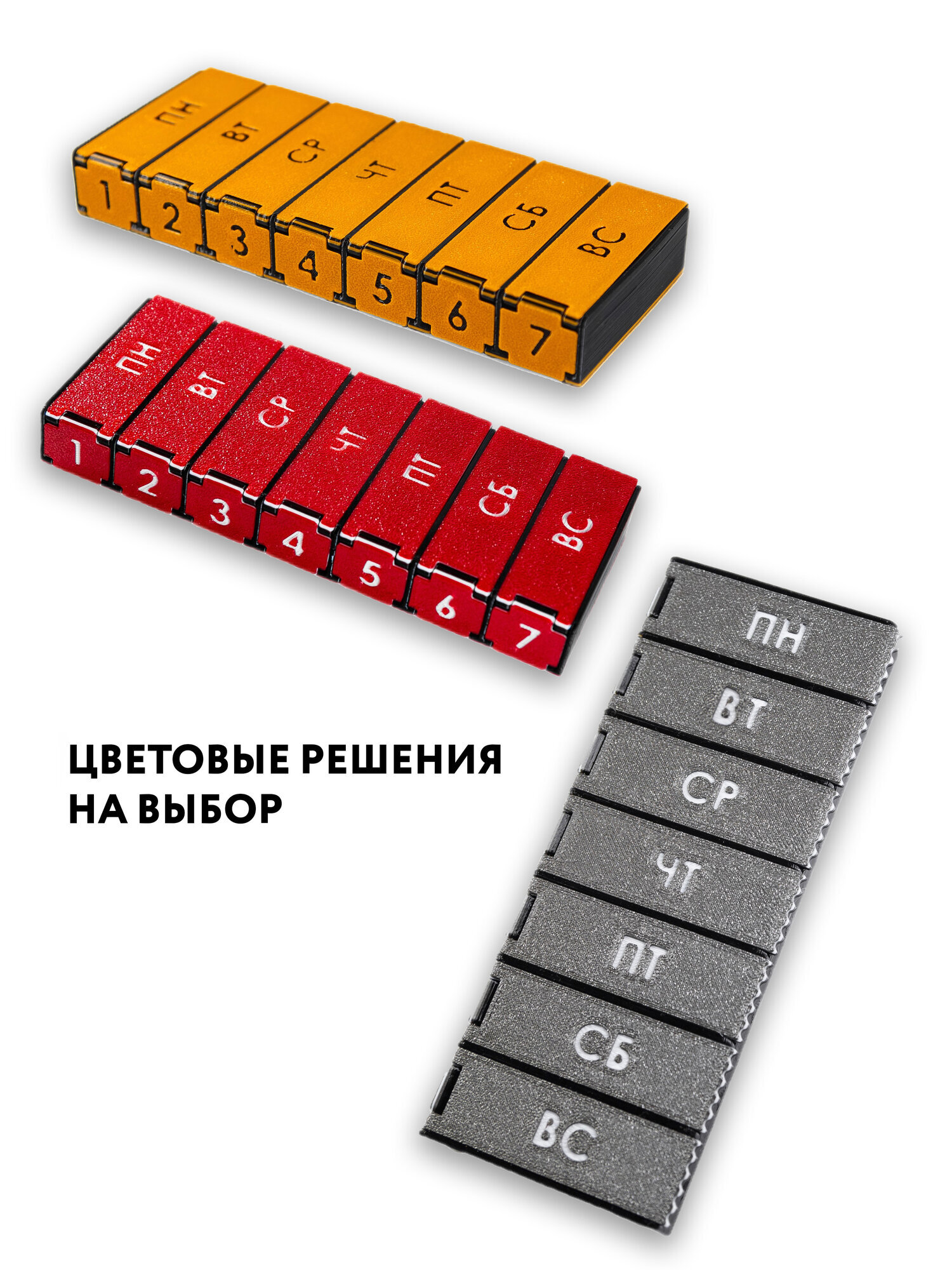 Таблеточница с индивидуальными крышками для хранения таблеток подходит также для витаминов и БАДов.