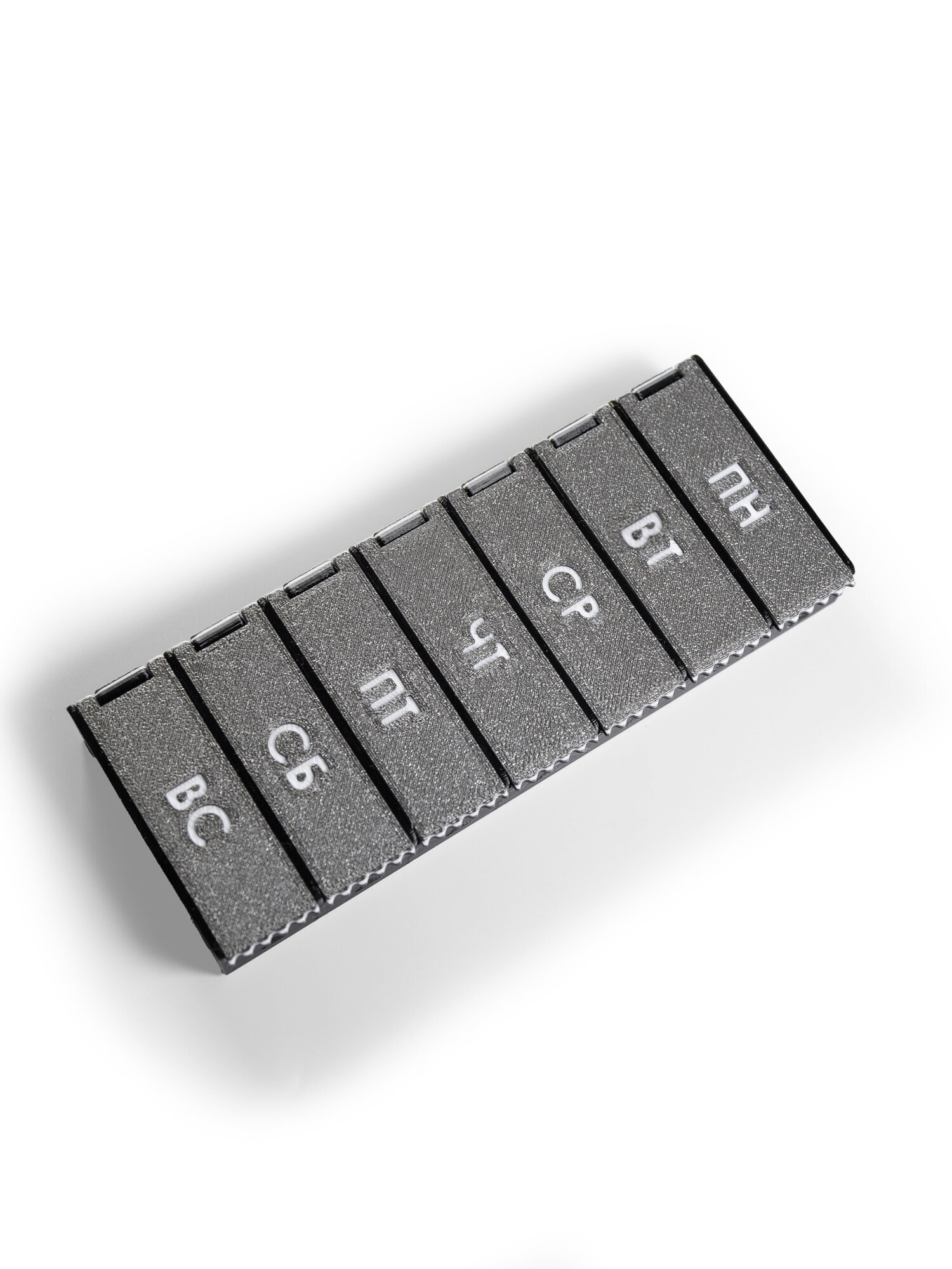 Таблетница на неделю, на русском языке, 15х6х2 см, 3D печать, серая