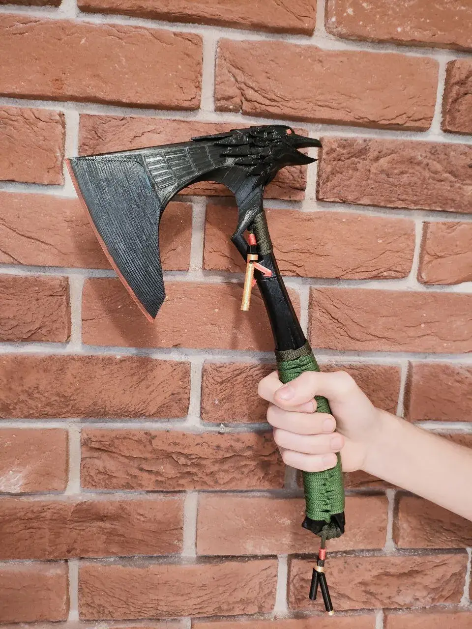 Напечатанная на 3д принтере из черного пластика PETG, сувенир-легендарка из игры Apex Legends - топор Бладхаунда в натуральную величину.Цвет - черный, с оплеткой из зеленой нейлоновой нити, Акриловая покраска края лезвия в красный цвет, при необходимости серебряное патинирование акрилом.Кастомный предмет, подарок геймеру или коллекционеру игровых сувениров.Длина 35,5 см.
